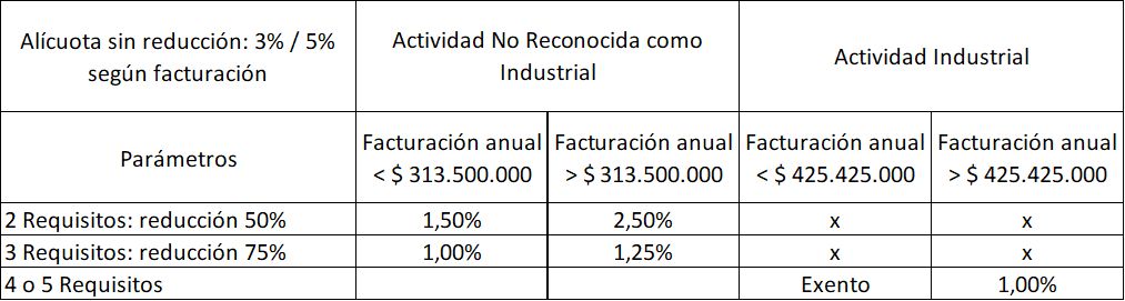 - Importante: La reducción de la alícuota para los supuestos de 2 o 3 compromisos, no podrá ser inferior a la alícuota aplicable para la actividad industrial en la Ciudad Autónoma de Buenos Aires, que al beneficiario le correspondiera de conformidad con la Tarifaria vigente.