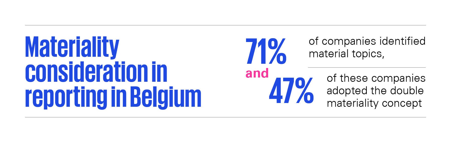Notably, 47% of Belgian N100 companies already adopted the double materiality concept as introduced by the CSRD, combining both the impact and financial materiality perspective, reflecting a sophisticated and comprehensive approach to materiality assessment.