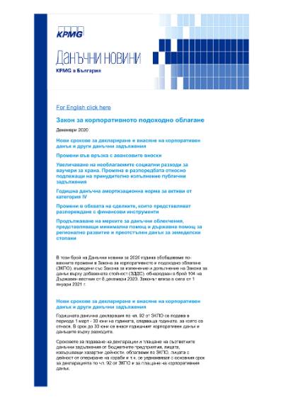 In this publication of Tax News for 2020 we summarize the more substantial amendments in the Corporate Income Tax Act (CITA) introduced by the Act amending and supplementing the Value Added Tax Act published in the Bulgarian State Gazette No. 104 of December 8, 2020. The Act enters into force on 1 January 2021.