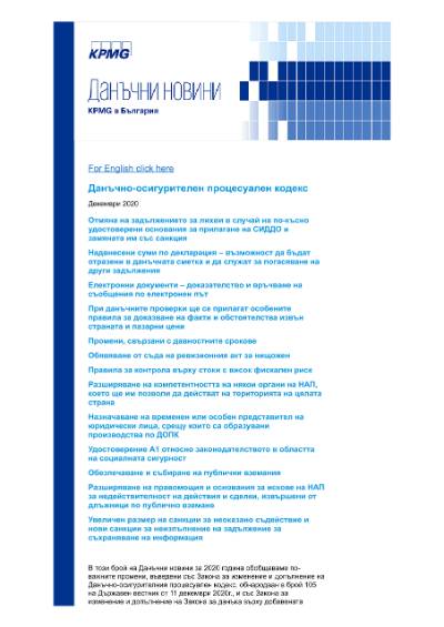 In this publication of Tax News for 2020 we summarize the most important amendments introduced by the Act amending and supplementing the Tax and Social Insurance Procedure Code published in the Bulgarian State Gazette No. 105 of December 11, 2020 and by the Act amending and supplementing the Value Added Tax Act published in the Bulgarian State Gazette No. 104 of December 8, 2020. The changes enter into force on January 1, 2021.
