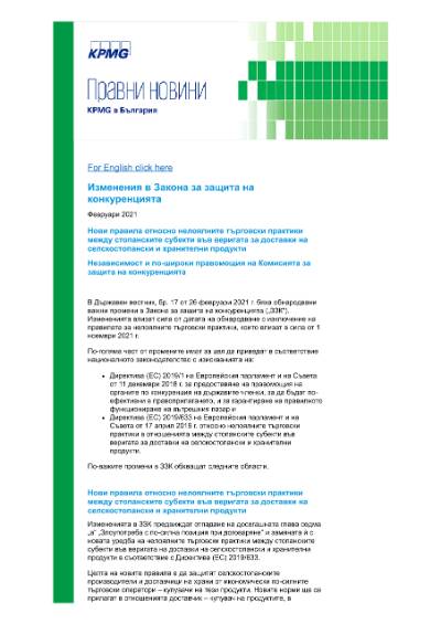 Important amendments to the Competition Protection Act (the “CPA”) were adopted in State Gazette, issue 17 dated 26 February 2021. The amendments shall enter into force as of the date of their promulgation in the State Gazette, except for the new rules on unfair trading practices which shall enter into force as of 1 November 2021.
