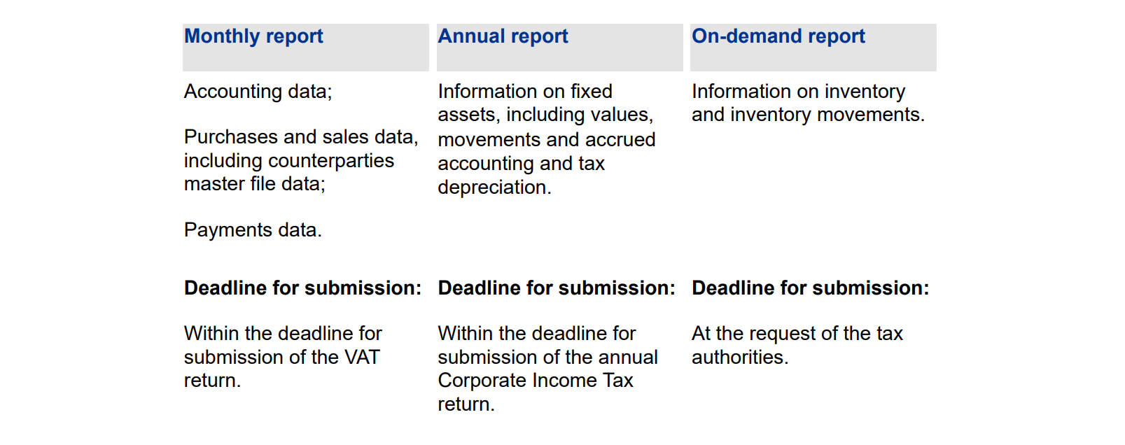The Bulgarian SAF-T report will contain business and accounting data, which should be submitted in a standardized format on a monthly basis, annual basis or upon request as follows: