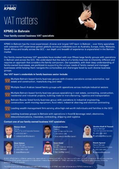 VAT impacts different economic sectors in different ways. Family businesses in Bahrain must assess their group holding structure and evaluate whether it is beneficial for them to apply for a group VAT registration comprising of various entities under common ownership for efficient working capital management. Family investment offices should assess the VAT treatment of different revenue sources (whether from local or offshore investments) such as dividends, interest on debt securities and gains on sale of shares or foreign currency. Given the mix of supplies for a family investment office, it is essential to assess and classify expenses for input tax recovery purposes. This should be done with the objective of mitigating the risk of excess input tax recovery while reducing any input tax credit leakage. For transactions between different entities with common ownership, the valuation for VAT purposes must be examined as the related party valuation provisions may apply and the transaction value adopted for VAT purposes may be challenged by the NBR if it is lower than the market value of similar supplies.