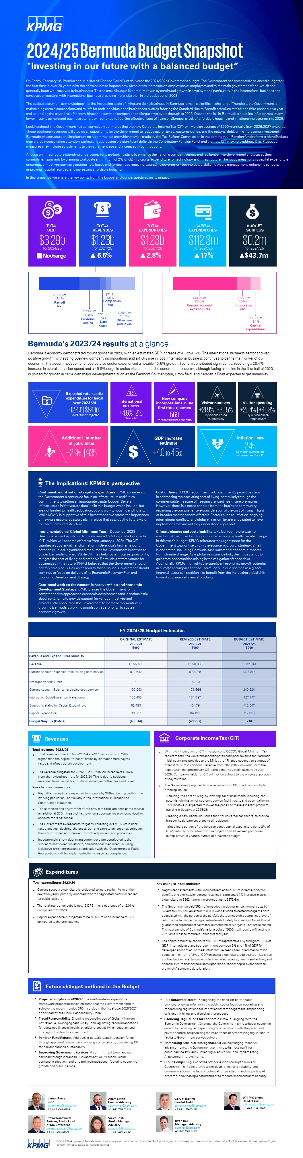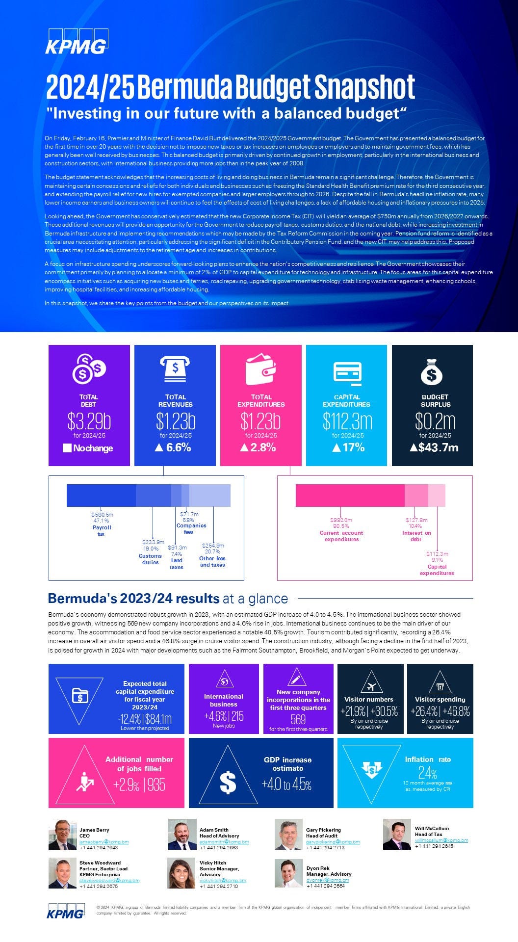 Following the Premier’s statement, KPMG in Bermuda provides commentary on highlights and its perspective on key items discussed in the Budget Statement within its 2024/25 Bermuda Budget Snapshot.