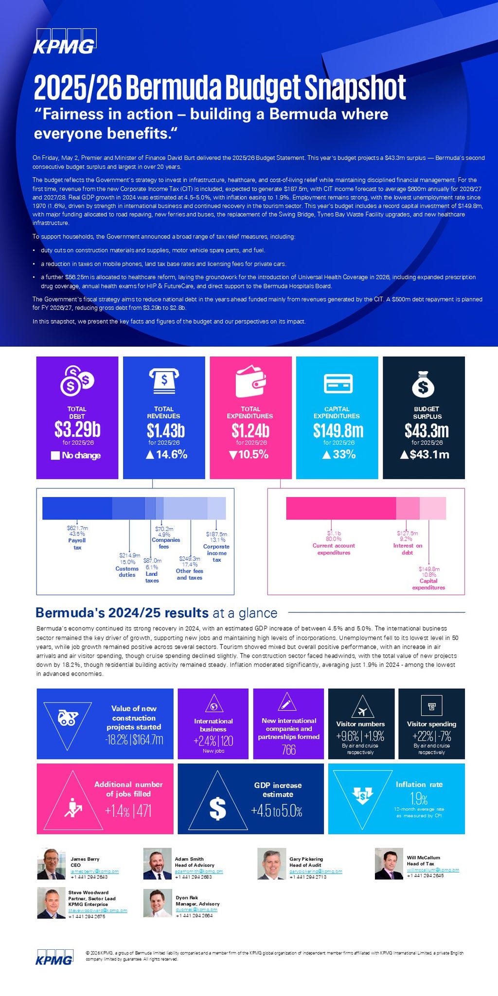 Following the Premier’s statement, KPMG in Bermuda provides commentary on highlights and its perspective on key items discussed in the Budget Statement within it 2025/26 Bermuda Budget Snapshot.