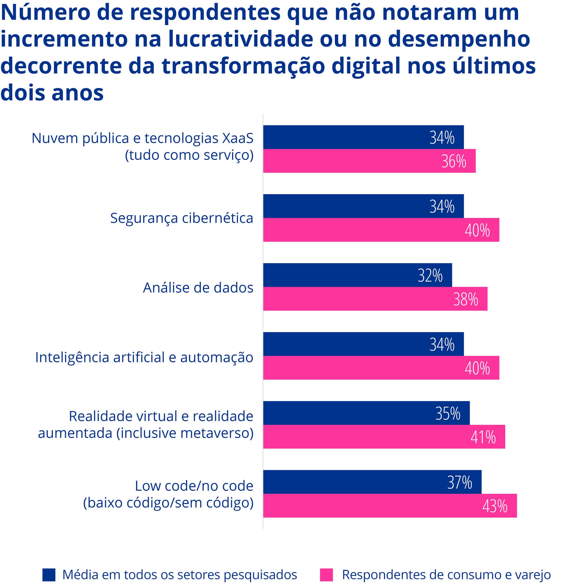 Mas nem todo investimento em tecnologia gerou retorno: empresas de consumo e varejo têm mais probabilidade do que a média intersetorial de relatar que seus investimentos em transformação tecnológica nos últimos dois anos não aumentaram seus lucros ou níveis de desempenho.