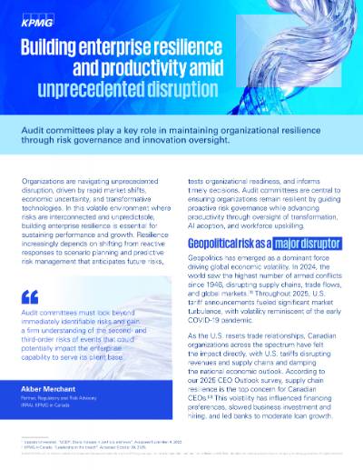 Organizations are navigating unprecedented disruption, driven by rapid market shifts, economic uncertainty, and transformative technologies. In this volatile environment where risks are interconnected and unpredictable, building enterprise resilience is essential for sustaining performance and growth. Resilience increasingly depends on shifting from reactive responses to scenario planning and predictive risk management that anticipates future risks, tests organizational readiness, and informs timely decisions. Audit committees are central to ensuring organizations remain resilient by guiding proactive risk governance while advancing productivity through oversight of transformation, AI adoption, and workforce upskilling.