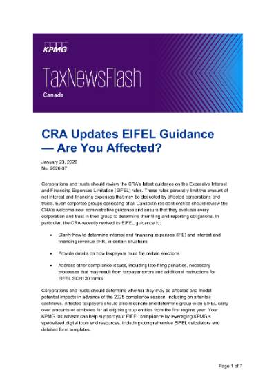 Corporations and trusts should review the CRA’s latest guidance on the Excessive Interest and Financing Expenses Limitation (EIFEL) rules. These rules generally limit the amount of net interest and financing expenses that may be deducted by affected corporations and trusts. Even corporate groups consisting of all Canadian-resident entities should review the CRA’s welcome new administrative guidance and ensure that they evaluate every corporation and trust in their group to determine their filing and reporting obligations. In particular, the CRA recently revised its EIFEL guidance to: