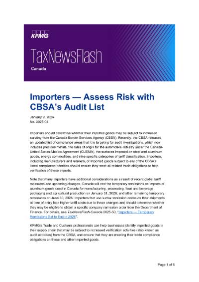 Importers should determine whether their imported goods may be subject to increased scrutiny from the Canada Border Services Agency (CBSA). Recently, the CBSA released an updated list of compliance areas that it is targeting for audit investigations, which now includes precious metals, the rules of origin for the automotive industry under the Canada-United States-Mexico Agreement (CUSMA), the surtaxes imposed on steel and aluminum goods, energy commodities, and nine specific categories of tariff classification. Importers, including manufacturers and retailers, of imported goods subject to any of the CBSA’s listed compliance priorities should ensure they meet all related trade obligations to help verification of these imports.