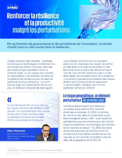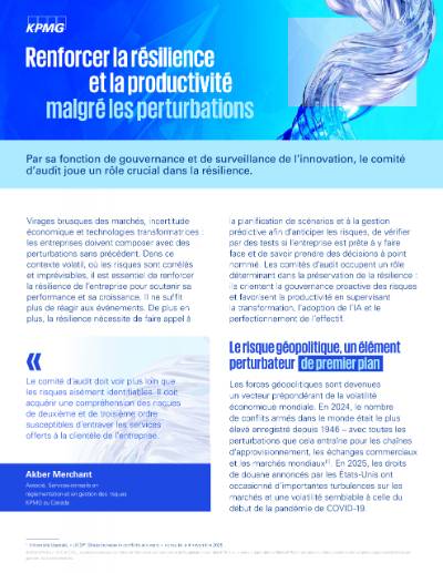 Virages brusques des marchés, incertitude économique et technologies transformatrices : les entreprises doivent composer avec des perturbations sans précédent. Dans ce contexte volatil, où les risques sont corrélés et imprévisibles, il est essentiel de renforcer la résilience de l’entreprise pour soutenir sa performance et sa croissance. Il ne suffit plus de réagir aux événements. De plus en plus, la résilience nécessite de faire appel à la planification de scénarios et à la gestion prédictive afin d’anticiper les risques, de vérifier par des tests si l’entreprise est prête à y faire face et de savoir prendre des décisions à point nommé. Les comités d’audit occupent un rôle déterminant dans la préservation de la résilience : ils orientent la gouvernance proactive des risques et favorisent la productivité en supervisant la transformation, l’adoption de l’IA et le perfectionnement de l’effectif.