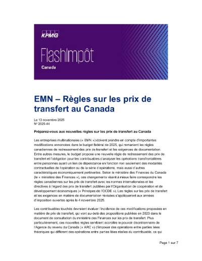 Les entreprises multinationales (« EMN ») doivent prendre en compte d’importantes modifications annoncées dans le budget fédéral de 2025, qui remanient les règles canadiennes de redressement des prix de transfert et les exigences de documentation. Entre autres mesures, le budget propose une nouvelle règle de redressement des prix de transfert et l’obligation pour les contribuables d’analyser les opérations transfrontalières entre personnes ayant un lien de dépendance en fonction non seulement des modalités contractuelles de l’opération ou de la série d’opérations, mais aussi d’autres caractéristiques économiquement pertinentes. Selon le ministère des Finances du Canada (le « ministère des Finances »), ces changements visent à mieux faire correspondre les règles canadiennes sur les prix de transfert avec les normes internationales et les directives à l’égard des prix de transfert publiées par l’Organisation de coopération et de développement économiques (« Principes de l’OCDE »). Les règles sur les prix de transfert et les exigences en matière de documentation révisées s’appliqueront aux années d’imposition ouvertes après le 4 novembre 2025.
