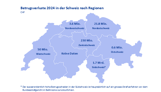 Mit CHF 1,7 Milliarden verzeichnete das Tessin 2024 ungewöhnlich hohe Betrugsverluste. Ausschlaggebend war ein bedeutender Strafprozess vor dem Bundesstrafgericht in Bellinzona. Die übrigen Regionen verzeichneten deutlich geringere Beträge – etwa die Zentralschweiz mit CHF 230 Millionen und die Romandie mit CHF 50 Millionen. Die Ostschweiz verzeichnete mit CHF 0,6 Millionen die niedrigsten gemeldeten Verluste. Für einige Regionen lagen keine Daten vor.