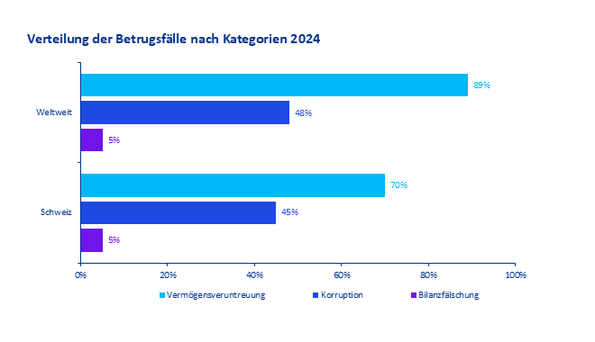 Global sind Vermögensveruntreuungen mit 89 % der Fälle die mit Abstand häufigste Betrugsform, gefolgt von Korruption (48 %) und Bilanzfälschung (5 %). Ein ähnliches Bild ergab die Analyse der Schweizer Betrugsfälle, allerdings mit leicht abweichenden Zahlen: Vermögensveruntreuungen machen 70 % der Fälle aus, Korruption 45 % und Bilanzfälschung 5 %.
