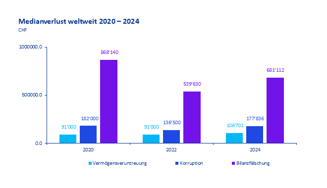 Aus den Daten lässt sich kein konstanter Trend für den Medianverlust im Zeitverlauf erkennen. In allen Beobachtungszeiträumen führt jedoch Bilanzfälschung durchweg zu den höchsten Medianverlusten, die 2024 einen Wert von CHF 681'112 erreichten. Deutlich geringere Verluste mit Medianwerten unter CHF 180'000 sind hingegen bei Unterschlagung und Korruption zu verzeichnen.