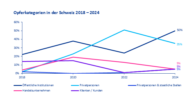 Die häufigsten Opfer waren 2024 Privatpersonen (35 %) und öffentliche Institutionen (50 %). Dagegen ist der Anteil der Fälle, in denen Handelsunternehmen betroffen waren, stark zurückgegangen, und Betrugsfälle bei staatlichen Stellen sind nach wie vor selten.