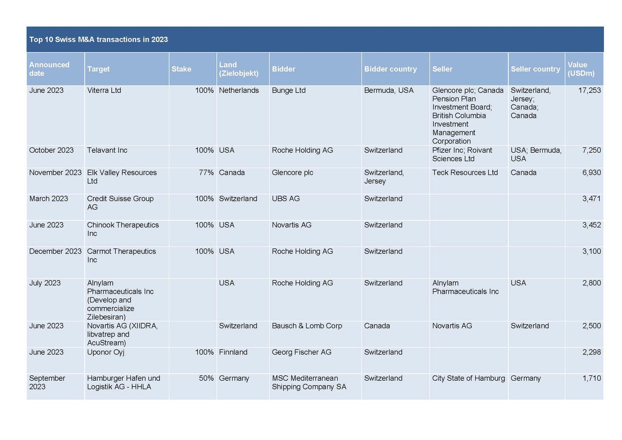 Table: Ten largest transactions with Swiss involvement in 2023