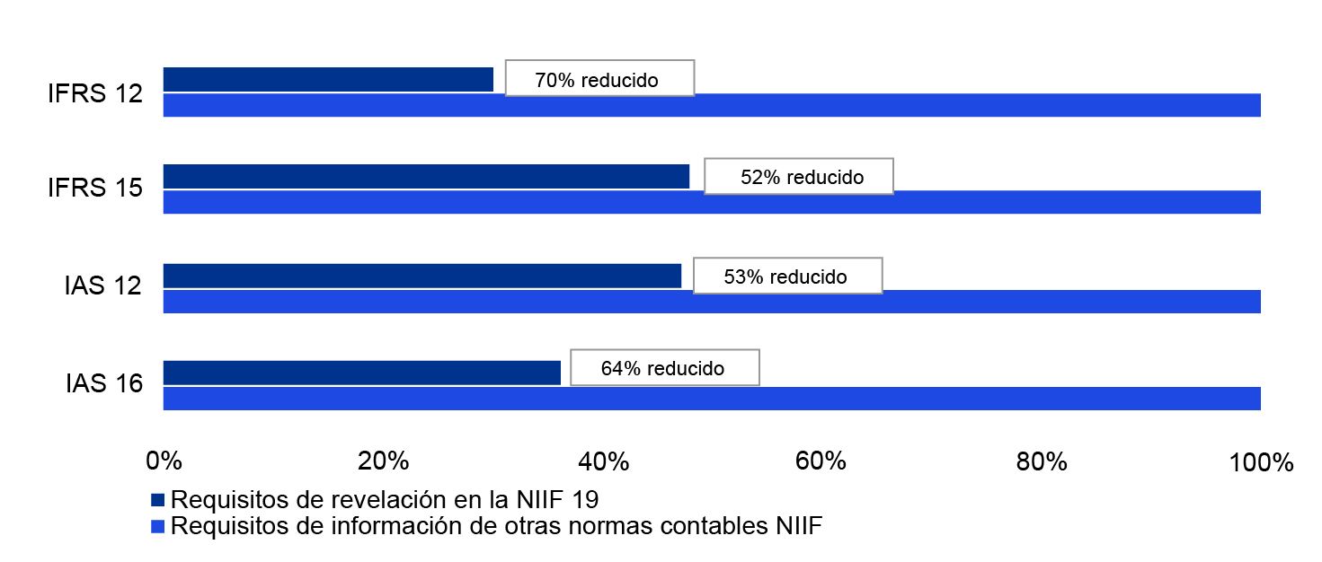 Al ser una Norma referida principalmente a revelaciones ¿Qué beneficios se generarían con su aplicación de la NIIF 19?. Esta Norma ayudará a beneficiarse de ahorros sin comprometer la utilidad de los estados financieros de las subsidiarias elegibles. Sin embargo, estos ahorros de costos pueden variar dependiendo de los requisitos contables actualmente aplicados, la configuración de los sistemas y procesos de presentación de informes dentro del grupo y de otros factores, como las leyes y regulaciones aplicables. En el siguiente cuadro, se observan algunos ejemplos que muestran en que porcentaje se reducirían las revelaciones en algunas Normas NIIF.