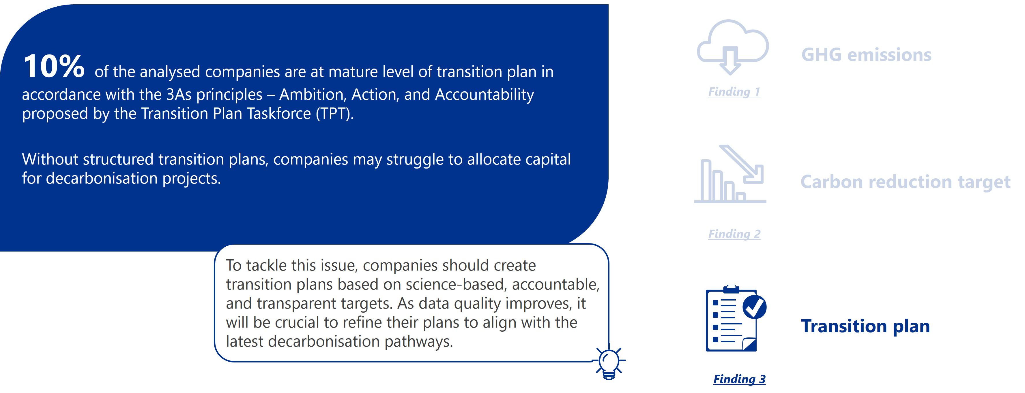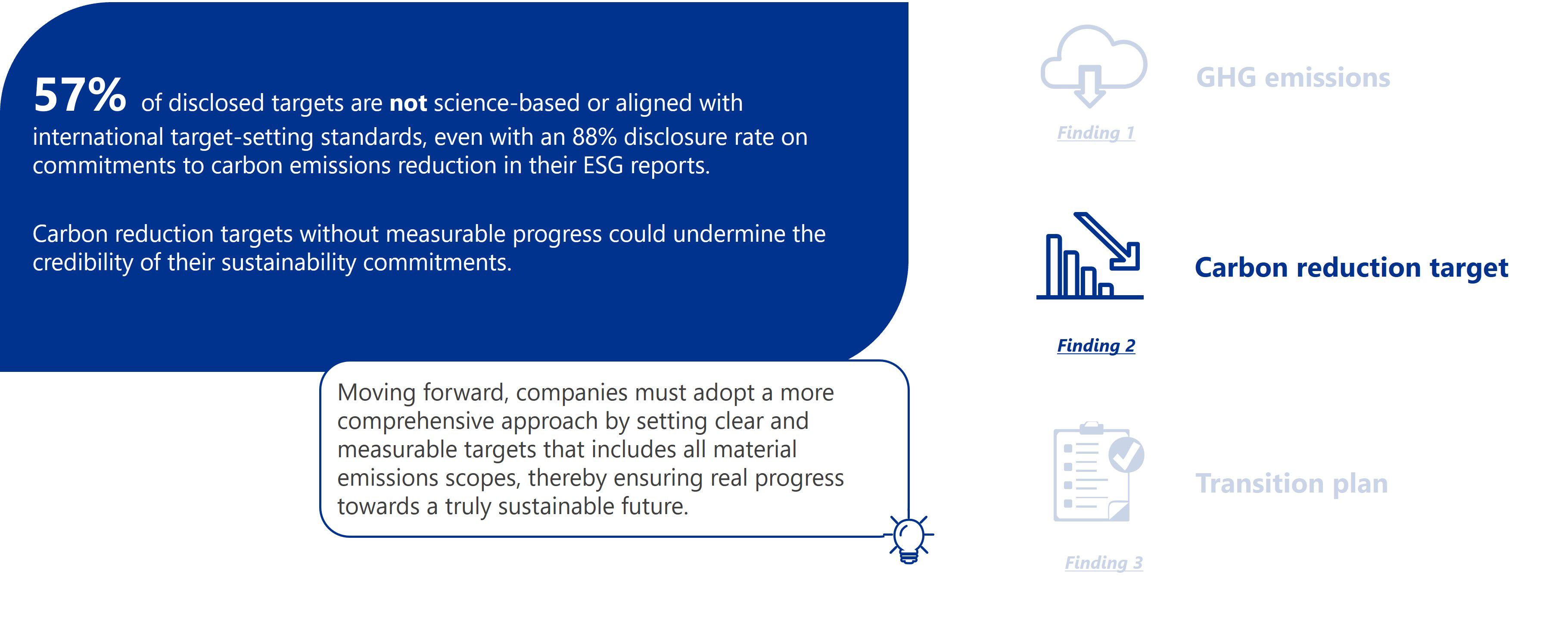 Our findings reflected major gaps in data, knowledge, and finance within three key areas: (1) GHG disclosure, (2) carbon reduction target setting, and (3) transition planning. In addition, our engagements with sector experts and corporate leaders have broadened our understanding of sector-specific decarbonisation journeys, including challenges and strategies.