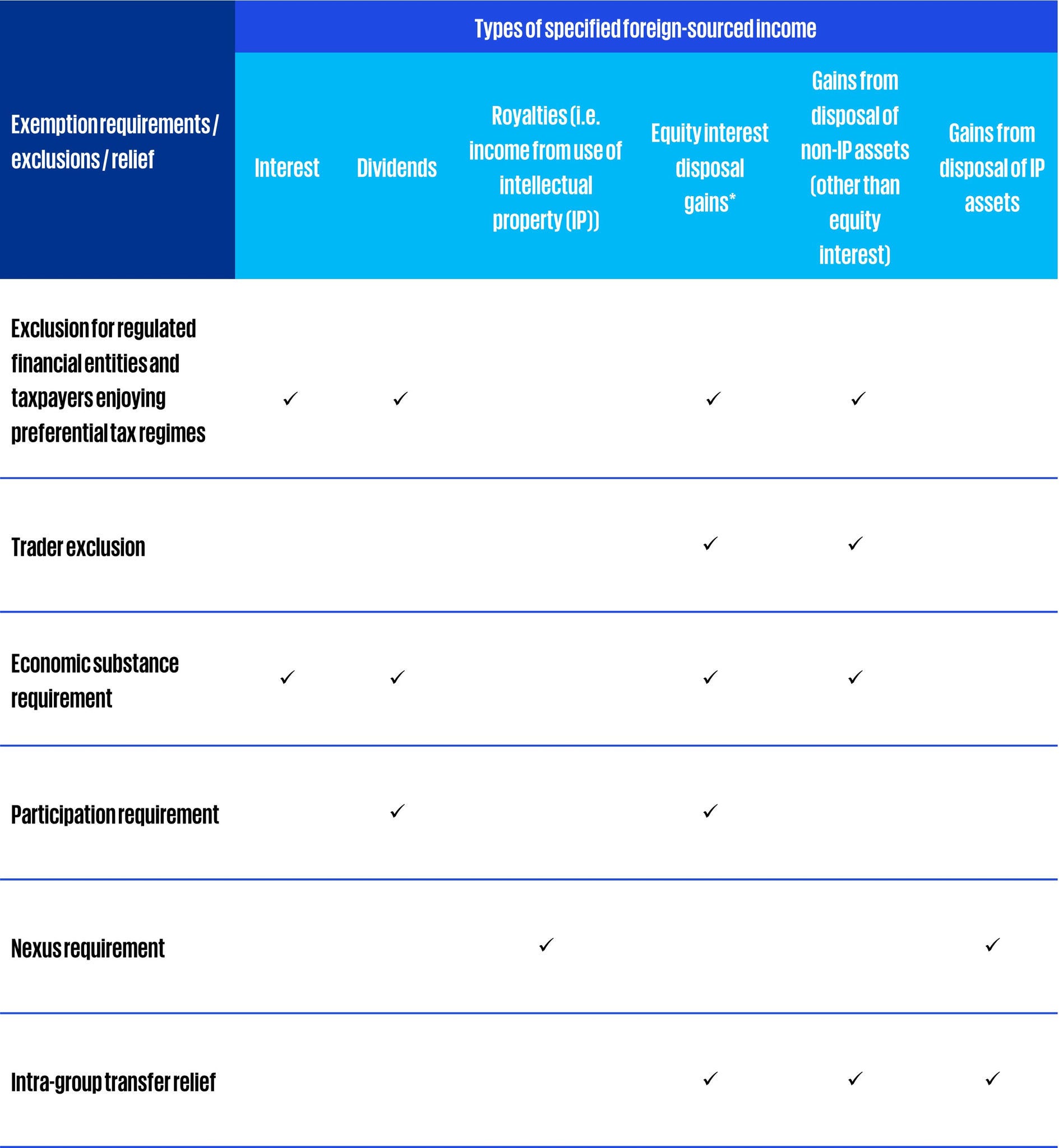 Given the effective date of the expanded FSIE regime is fast approaching, business groups in Hong Kong should assess whether they would be impacted by the expanded FSIE regime and explore possible options (e.g. applying the trader exclusion or building up the necessary economic substance in Hong Kong, etc.) to mitigate the potential impact. Please refer to the table in the Appendix for a summary of the exemption requirements / exclusions / relief for different types of specified foreign-sourced income under the expanded FSIE regime.