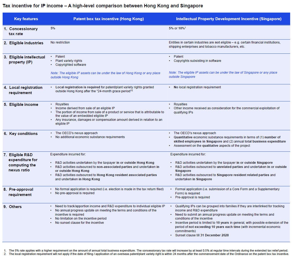 We set out a high-level comparison between the patent box tax incentive in Hong Kong and the Intellectual Property Development Incentive (IDI) in Singapore in the Appendix. As can be seen from the comparison, the incentive in Hong Kong is more competitive in a number of aspects - e.g., a lower concessionary tax rate (in certain circumstances), a wider scope of application, no economic substance requirements (other than the nexus requirement), no application, pre-approval or renewal requirements, and no sunset clause for the incentive.