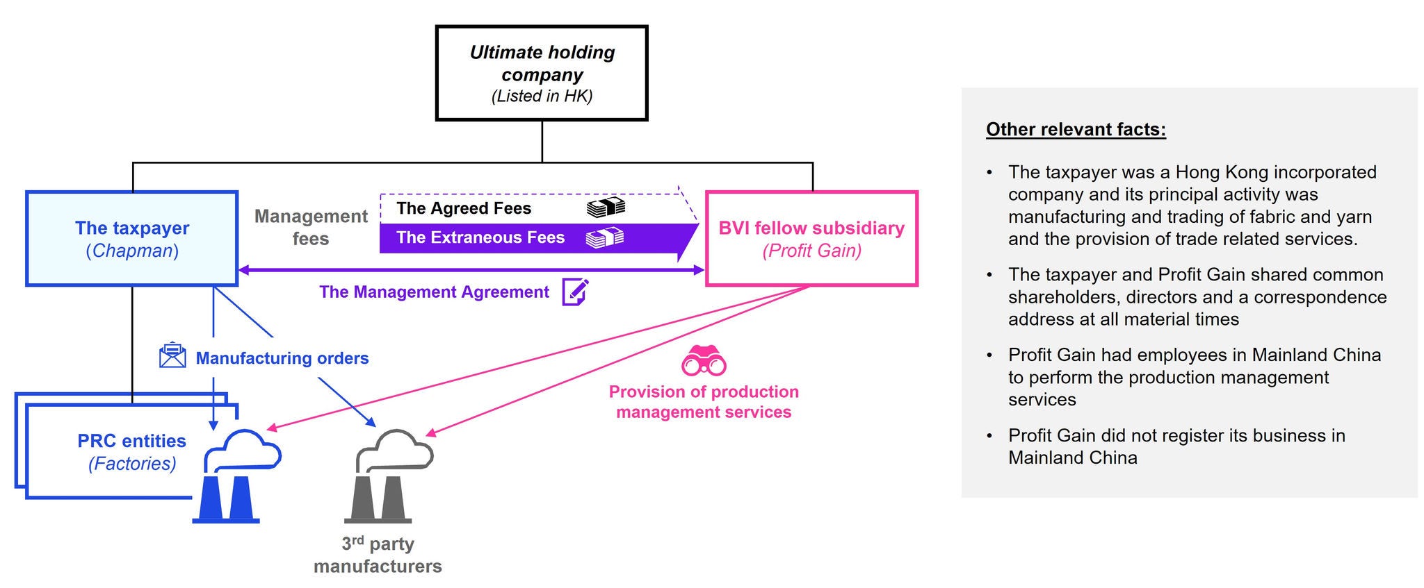 The Court of First Instance (CFI) recently held in a case that the management fees paid by a Hong Kong SAR company to its related company in the BVI are not deductible. The portion of the management fees paid in accordance with the contractual terms of a management agreement (the Agreed Fees) was held as non-deductible under the general anti-avoidance rule whereas the portion paid in excess of what was agreed (the Extraneous Fees) was held as non-deductible under the general expense deduction rule.