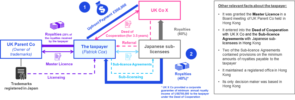 This could be due the specific fact pattern of this case where (1) the amount of royalties derived by the taxpayer would depend on the sub-licensees’ sales amounts (instead of being a fixed amount) and (2) the taxpayer (through UK X Co) provided various support to the sub-licensees on the design, manufacturing, promotion and sale of the products after the sub-licences were granted. Potentially, the Royalties Income derived by the taxpayer could be viewed as consisting of income from granting of the trademarks and income from provision of services to facilitate sales of the products in Japan.