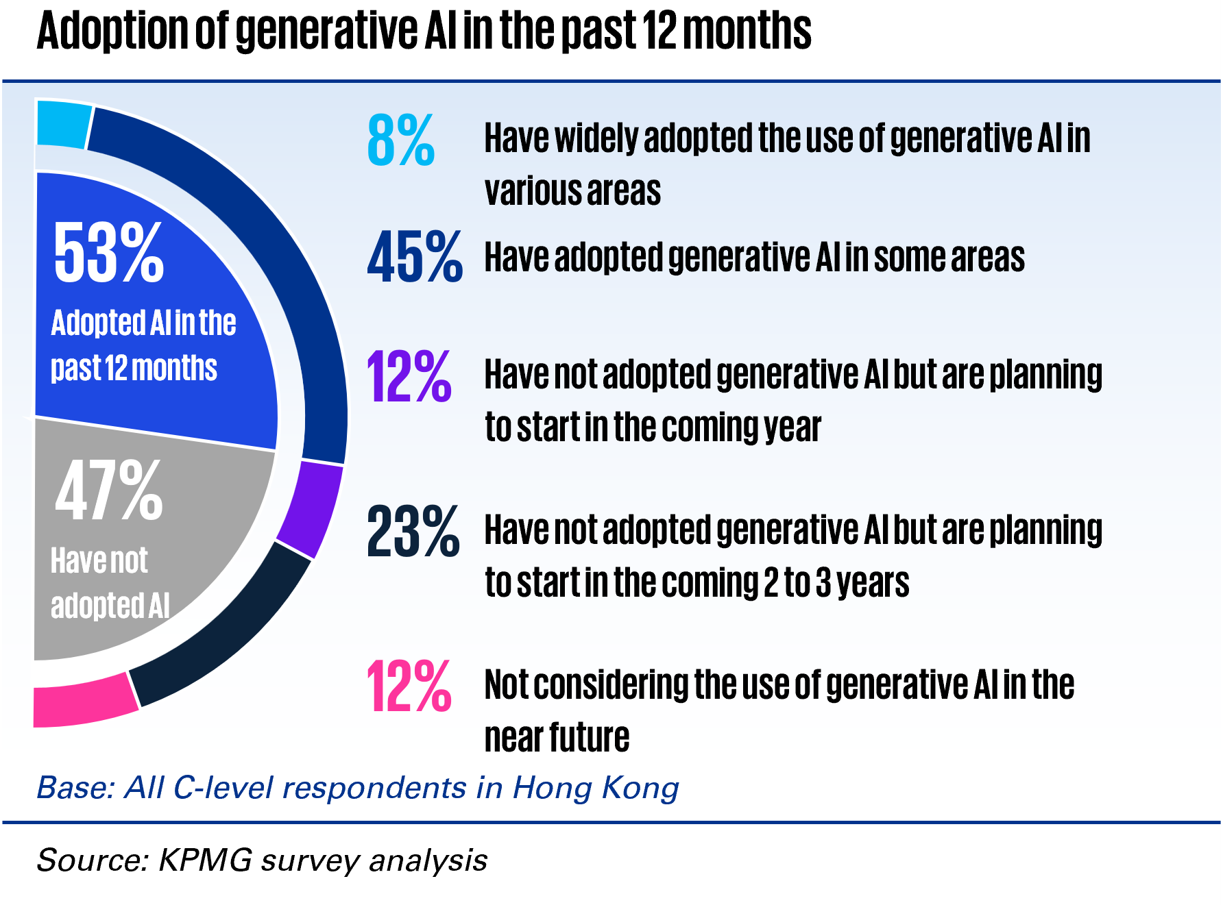 Nearly 90% of Hong Kong C-suite executives declare they either already implemented AI or anticipate implementing it within the next three years. It is primarily being adopted in operations, marketing and branding, sales and risk-management related areas.