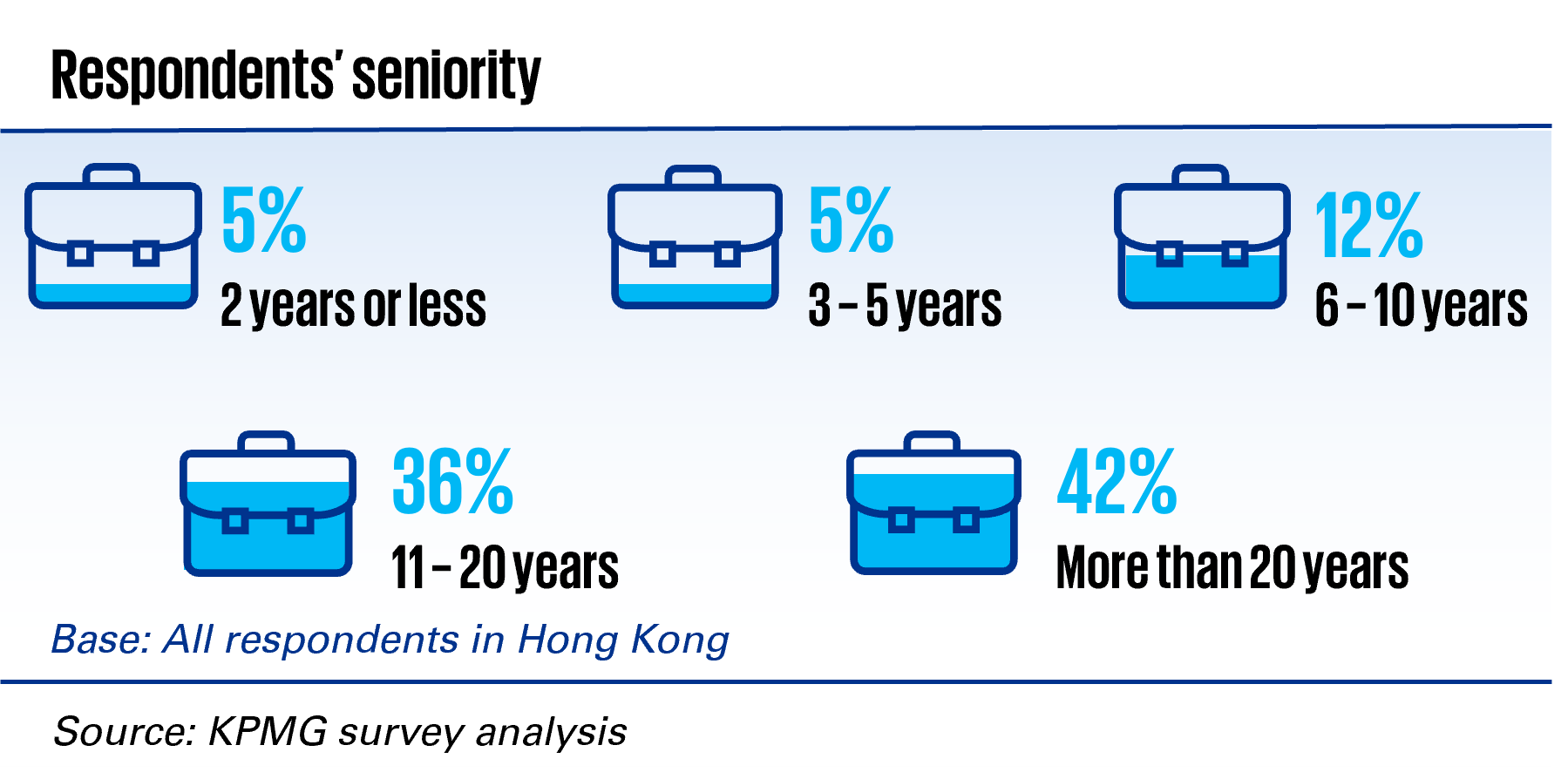 Respondents were drawn from various sectors, with 53% of respondents’ organisations being headquartered in Hong Kong. Among the respondents, 50% held leadership positions (21% C-level and 29% department head or equivalent).