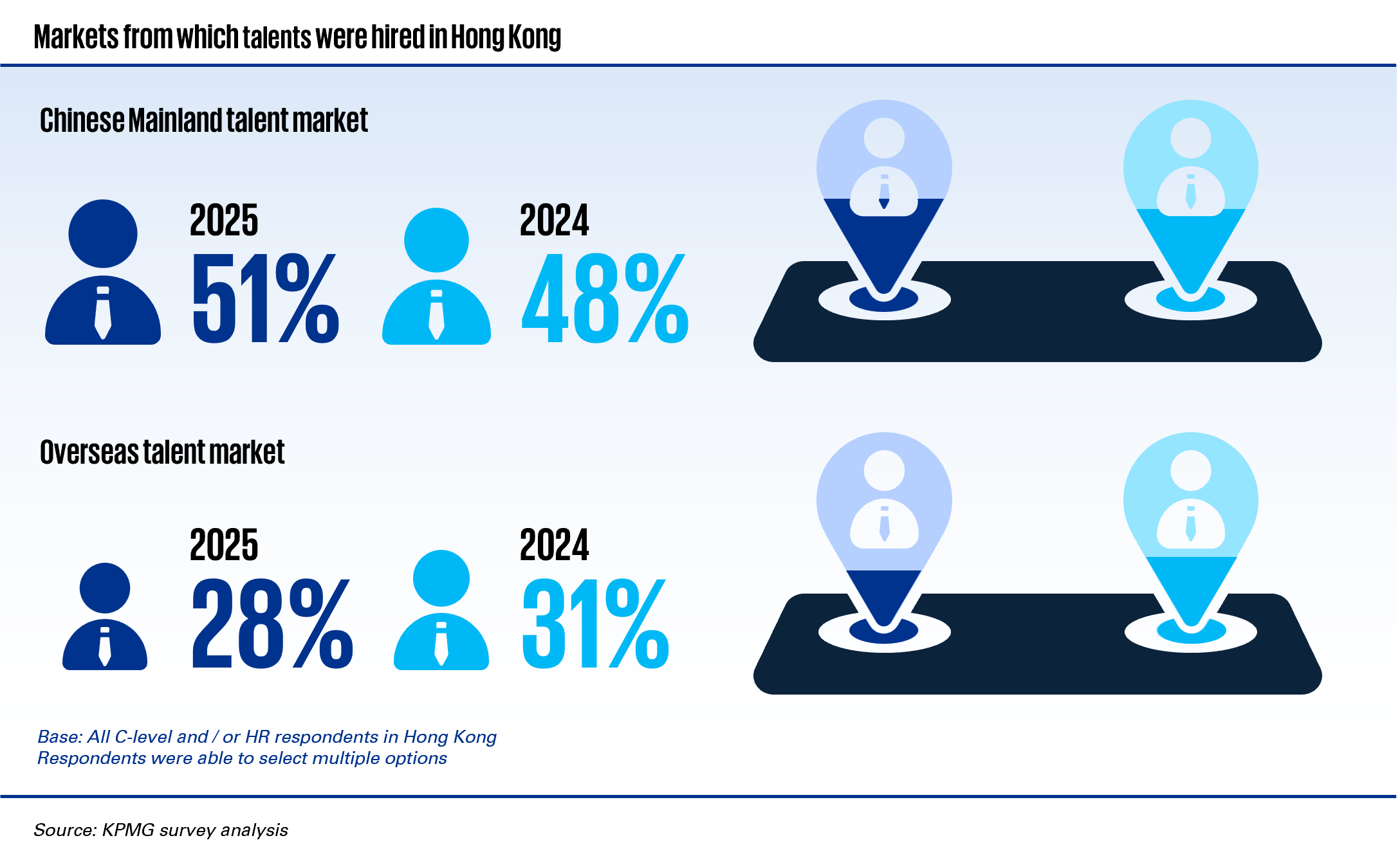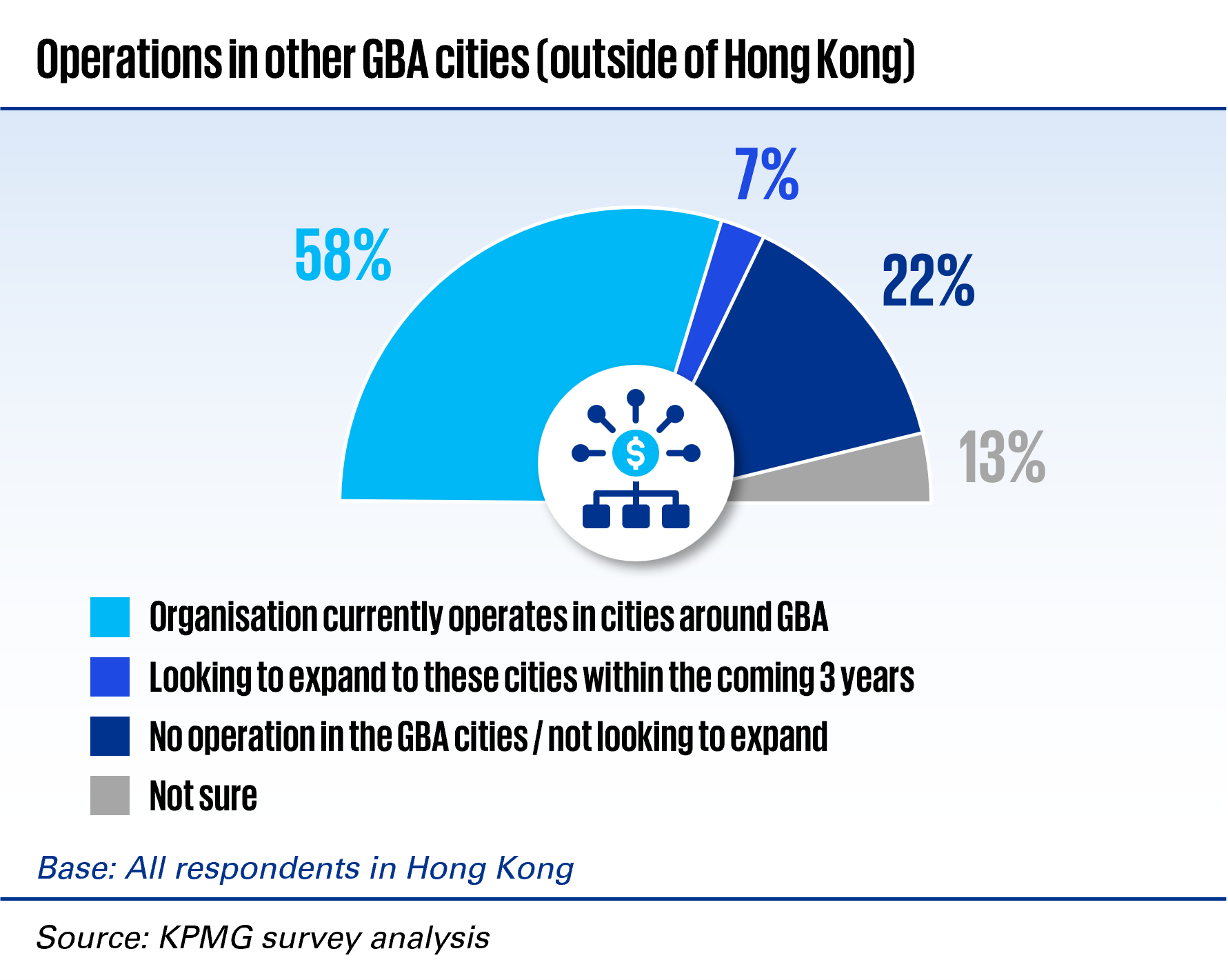 65% of respondents say their organisation is either already operating in other GBA cities (outside of Hong Kong) or planning to expand there within the next three years. With the growing talent pool and increasingly interconnected logistics within the GBA, more Hong Kong-based companies are capitalising on the opportunity to source talent from the region. The GBA's market potential, coupled with various tax incentive schemes, also provides strong incentives for companies to expand their operations within the area.
