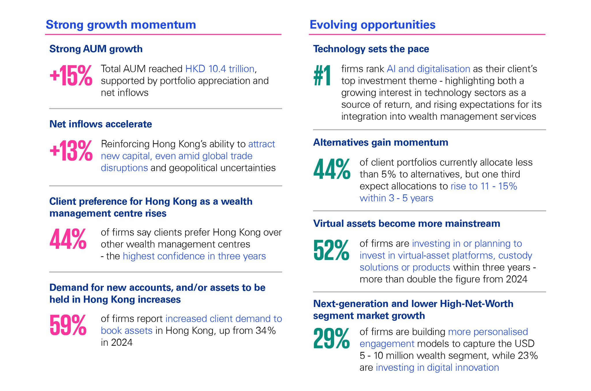 The findings are based on a survey of PWMA member institutions, supplemented by interviews with senior industry executives in Hong Kong. The surveys and interviews were conducted between June and August 2025, with around 80% of the Association’s Private Wealth Management (PWM) Institution members responding. This year we also sought feedback from 9 of the Association’s PWM ecosystem members in the business of asset management, as well as 5 nonmember firms involved in digital assets or exchanges.