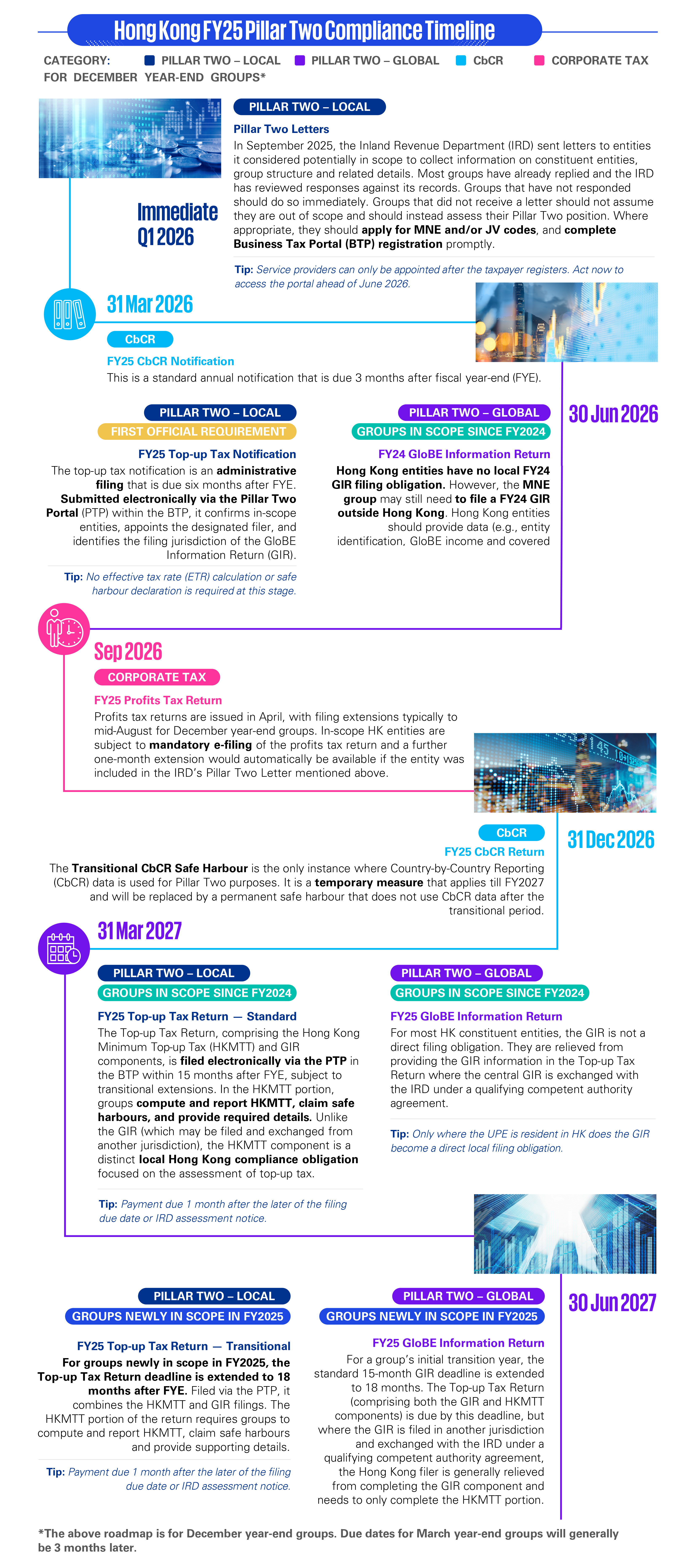 With Hong Kong’s Pillar Two framework entering its first year of implementation, in-scope MNE groups will be navigating their initial or early years of Pillar Two compliance. This article provides a practical roadmap to the key compliance milestones under Hong Kong’s Pillar Two regime, highlighting how each step interacts with existing profits tax and global reporting frameworks.