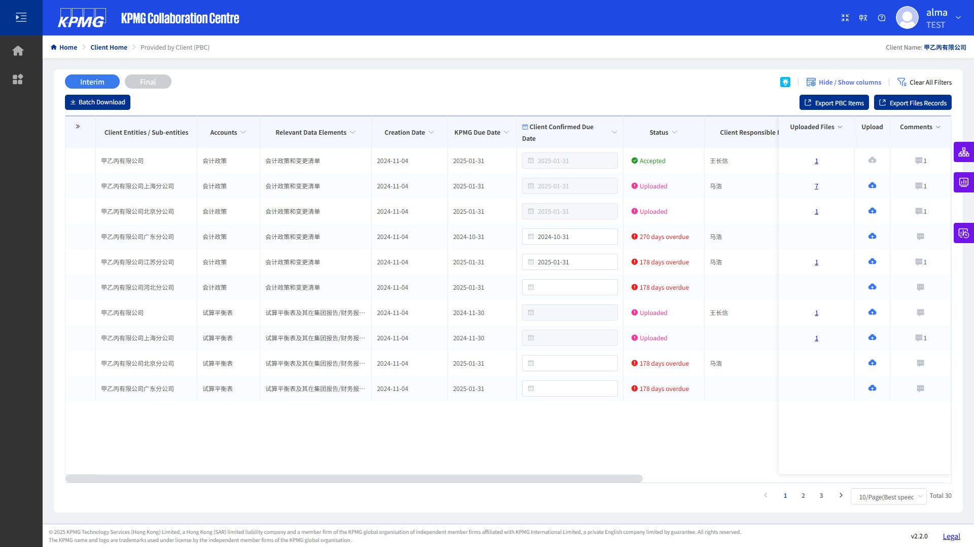 When clients see and submit information on the KCC portal, the dashboard interface is tailored to the specific circumstances of the engagement: including entities, information request (PBC) lists, due dates, both KPMG and client responsible persons, etc.