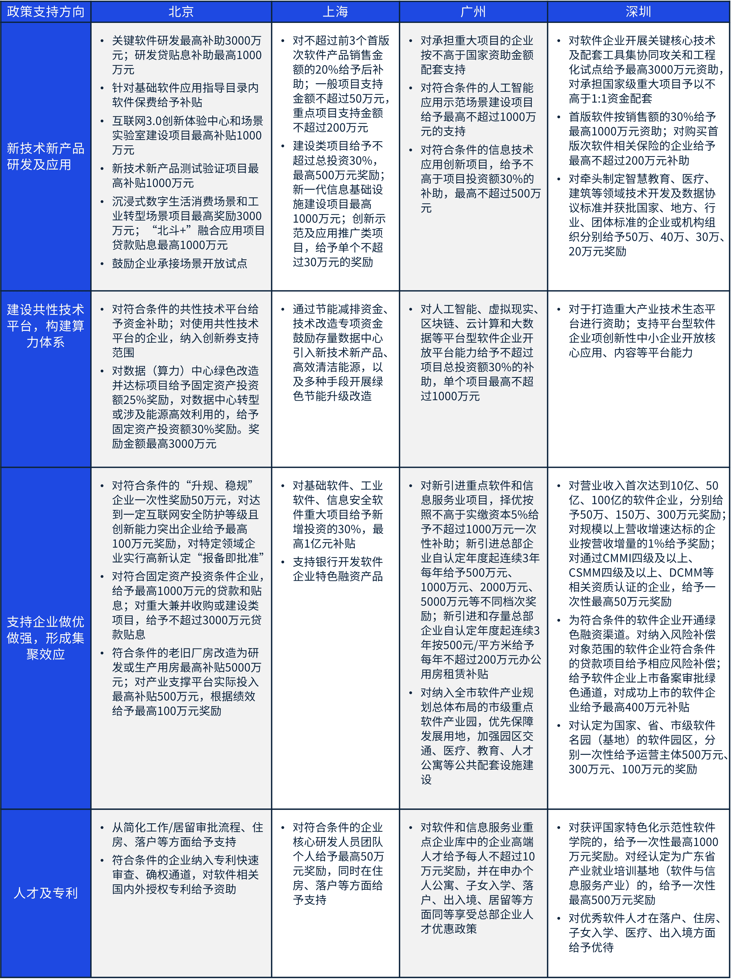 除北京外,全国其他主要城市也已推出或着手制定支持软件和信息服务业发展的相关鼓励政策。我们相信对于软件和信息服务业的政策支持将会是全国性的,并不断推进深化。下面我们将“若干措施”和上海、广州以及深圳的主要相关政策进行了相应的汇总,供读者参考借鉴: