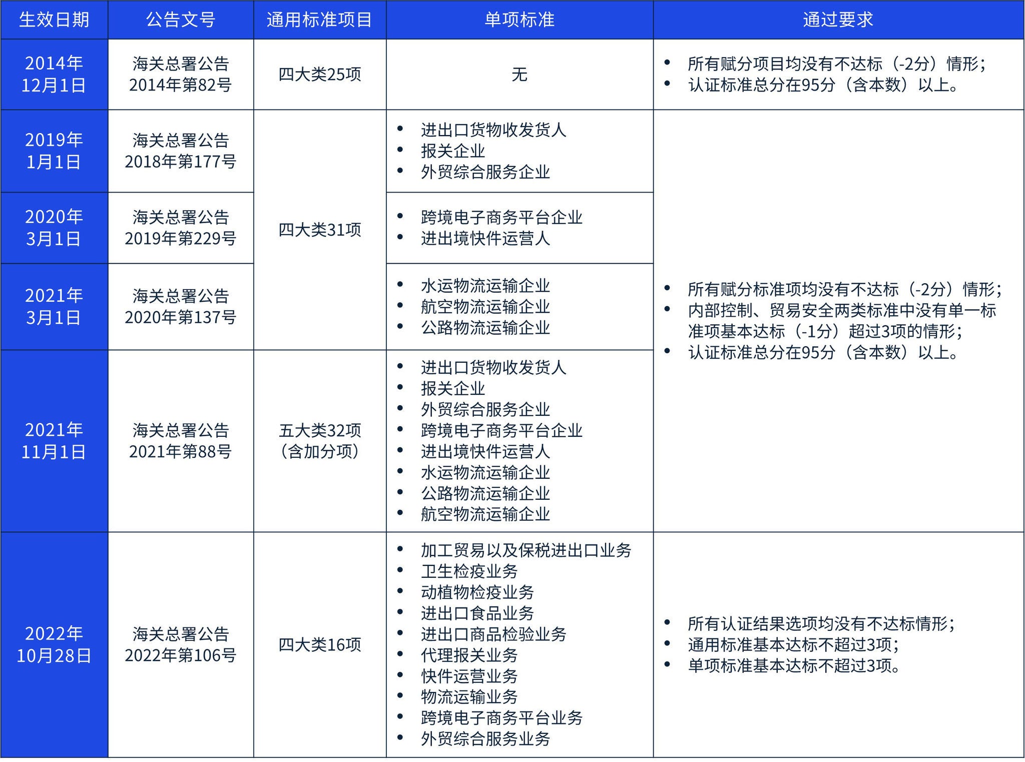 - 针对通过要求,除所有认证结果选项“均没有不达标情形”条件外,由“内部控制、贸易安全两类标准中没有单一标准项基本达标超过3项”的条件,调整为“通用标准基本达标不超过3项、单项标准基本达标不超过3项”,使通过认证的判断标准更加简单直接。此外,原认证标准中实际上要求基本达标项最多不能超过5个,相比之下新版认证标准基本达标项最多不能超过6个。