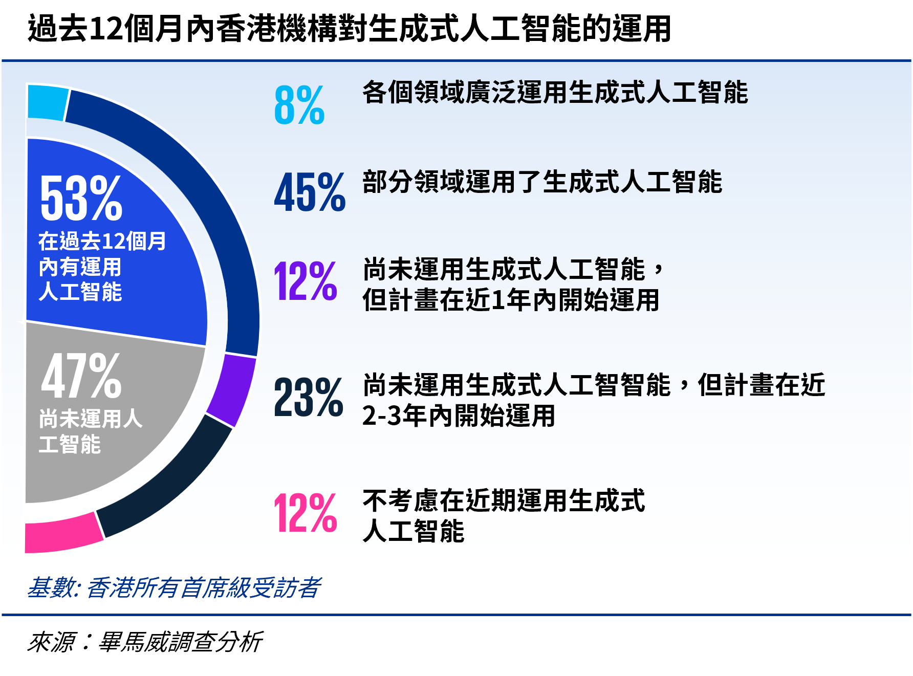 這些受訪者來自各行各業,有53%的受訪者所在機構總部設在香港;50%的受訪者擔任領導層職位(其中,21%為首席級;29%為部門主管或同等級別)。