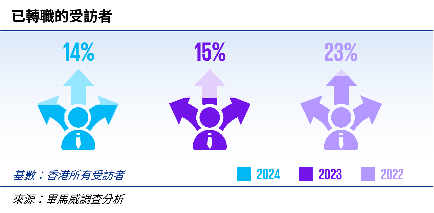 14%的受訪者在2024年轉職,主要來自消費品市場、金融服務、創新及科技行業。相比之下,曾積極尋找過新工作機會的受訪者高達39%。兩個數據彰顯出就業市場競爭日益激烈。