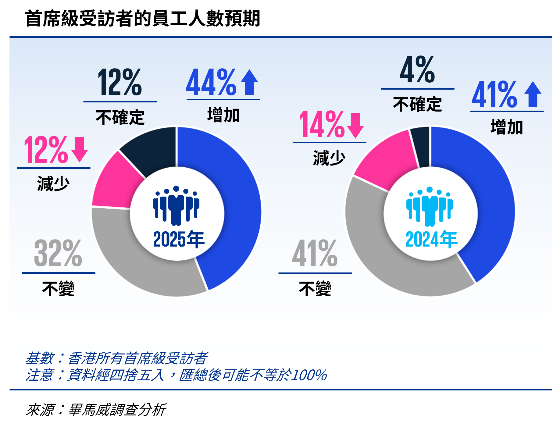 的首席級受訪者預期2025年會增加員工人數,反映出首席級受訪者的預期更為樂觀