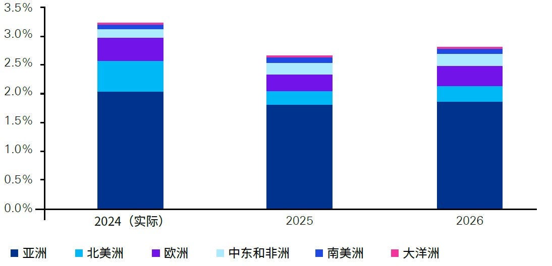 在上述诸多挑战中,也同时蕴藏着重大的机遇。本所经济学家预计,全球经济增长将于2025年触底,并于2026年回升(图1),亚洲仍将是全球主要的经济增长引擎。中美经济增速不高是全球经济增长放缓的一个相当大的因素。制造业向东南亚持续转移,可能会使印度尼西亚、越南和泰国等新兴市场产生新的贸易融资需求。然而,这些国家也面临着恢复“对等”关税的风险。