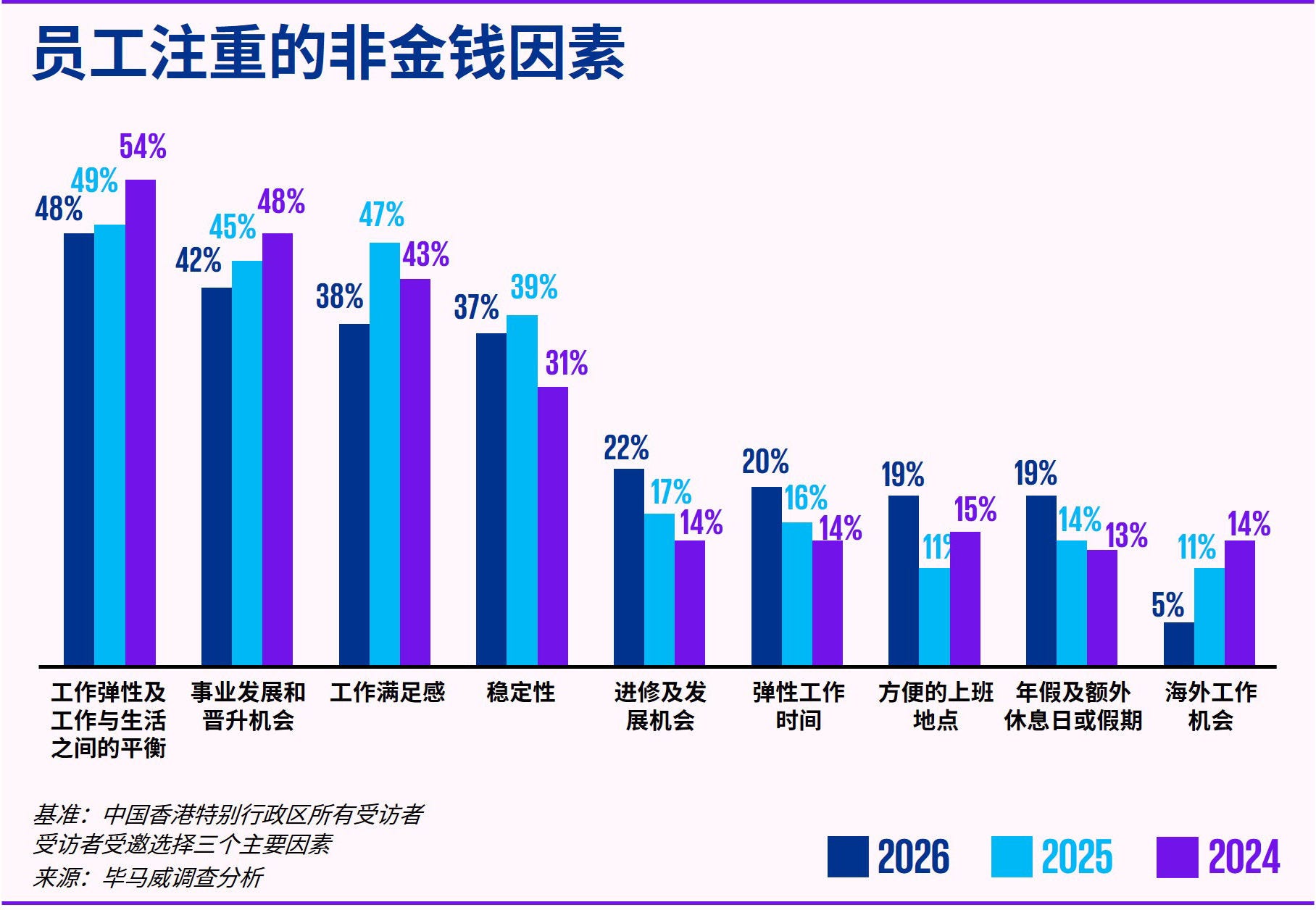工作弹性、事业发展和工作满足感一直是员工在考虑新机会时最优先考虑的三大非金钱因素。然而值得注意的是,工作满足感有所下降,从去年的47%降至今年的38%。