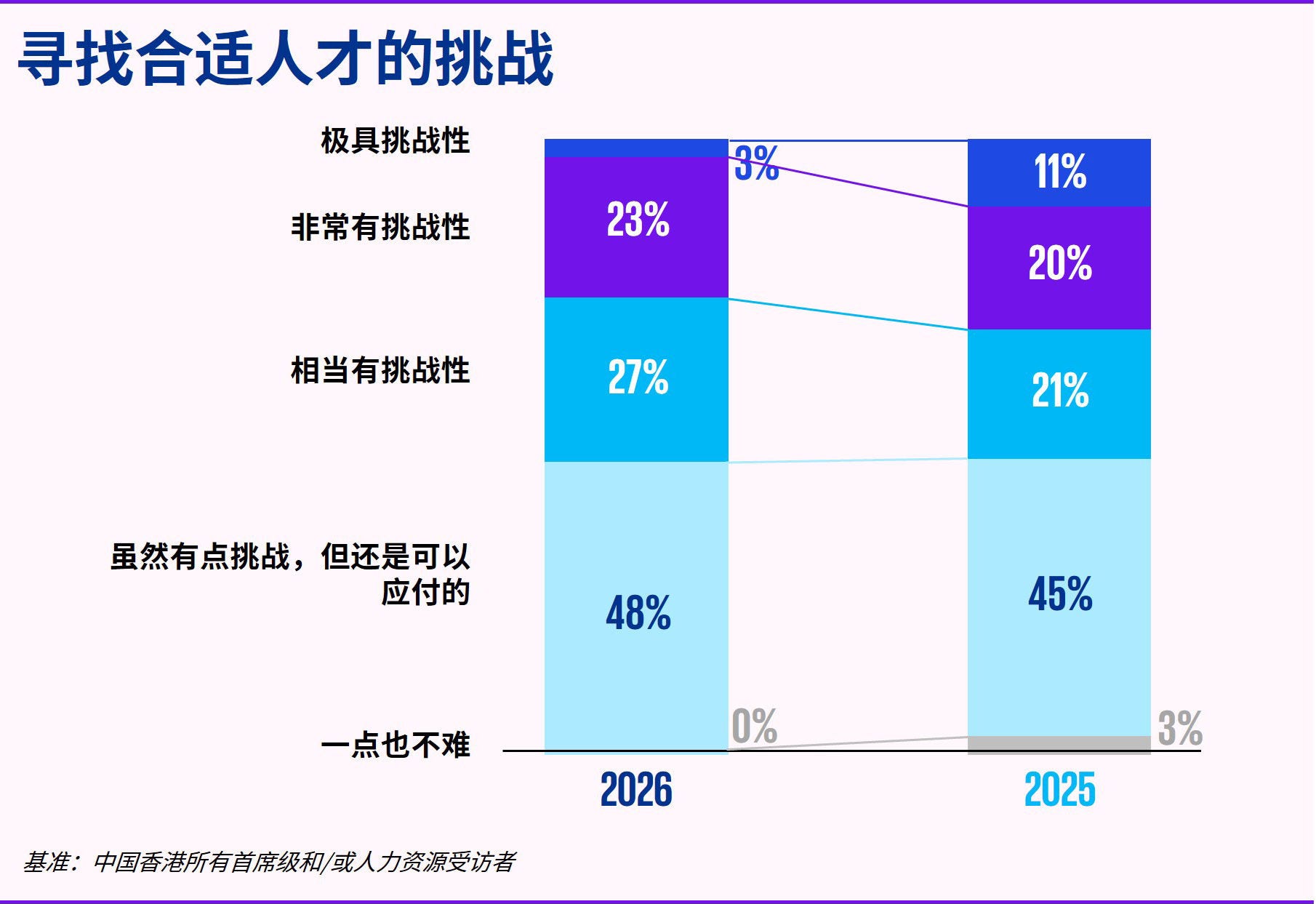 尽管所有人力资源和高管级受访者在招聘合适人才方面仍面临挑战,但认为招聘“极其艰难”的受访者比例已从2025年的11%降至2026年的仅3%。随着企业更有策略地从海外引进人才以弥补技能缺口,特别是在销售与市场营销、科技/信息技术、运营与供应链以及研发等领域,最严峻的困难较以往已明显缓解。