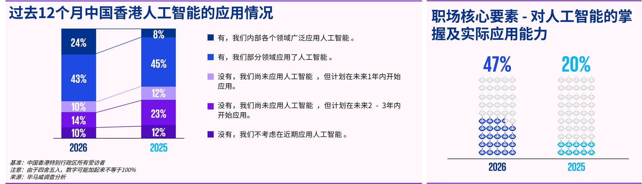 中国香港的人工智能应用正在加速发展,2026年有24%的企业已在广泛应用人工智能,这一比例是2025年的三倍。因此,掌握并应用人工智能已成为各行业、各层级员工最为关键的技能。