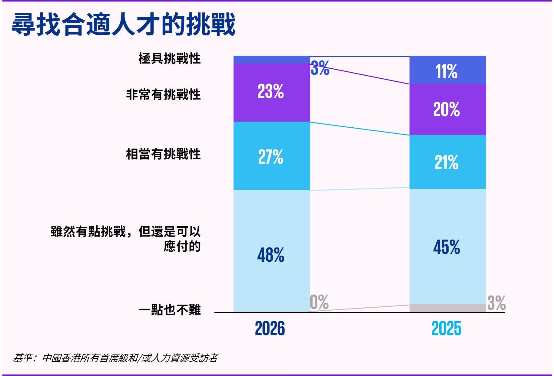 儘管所有人力資源和高管級受訪者在招聘合適人才方面仍面臨挑戰,但認為招聘「極其艱難」的受訪者比例已從2025年的11%降至2026年的僅3%。隨著企業更有策略地從海外引進人才以彌補技能缺口,特別是在銷售與市場營銷、科技/資訊技術、運營與供應鏈以及研發等領域,最嚴峻的困難較以往已明顯緩解。