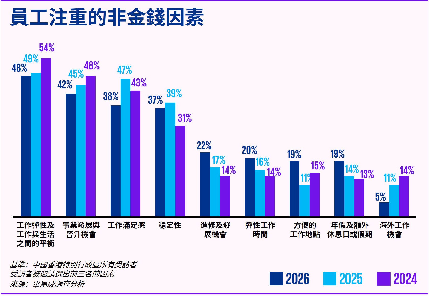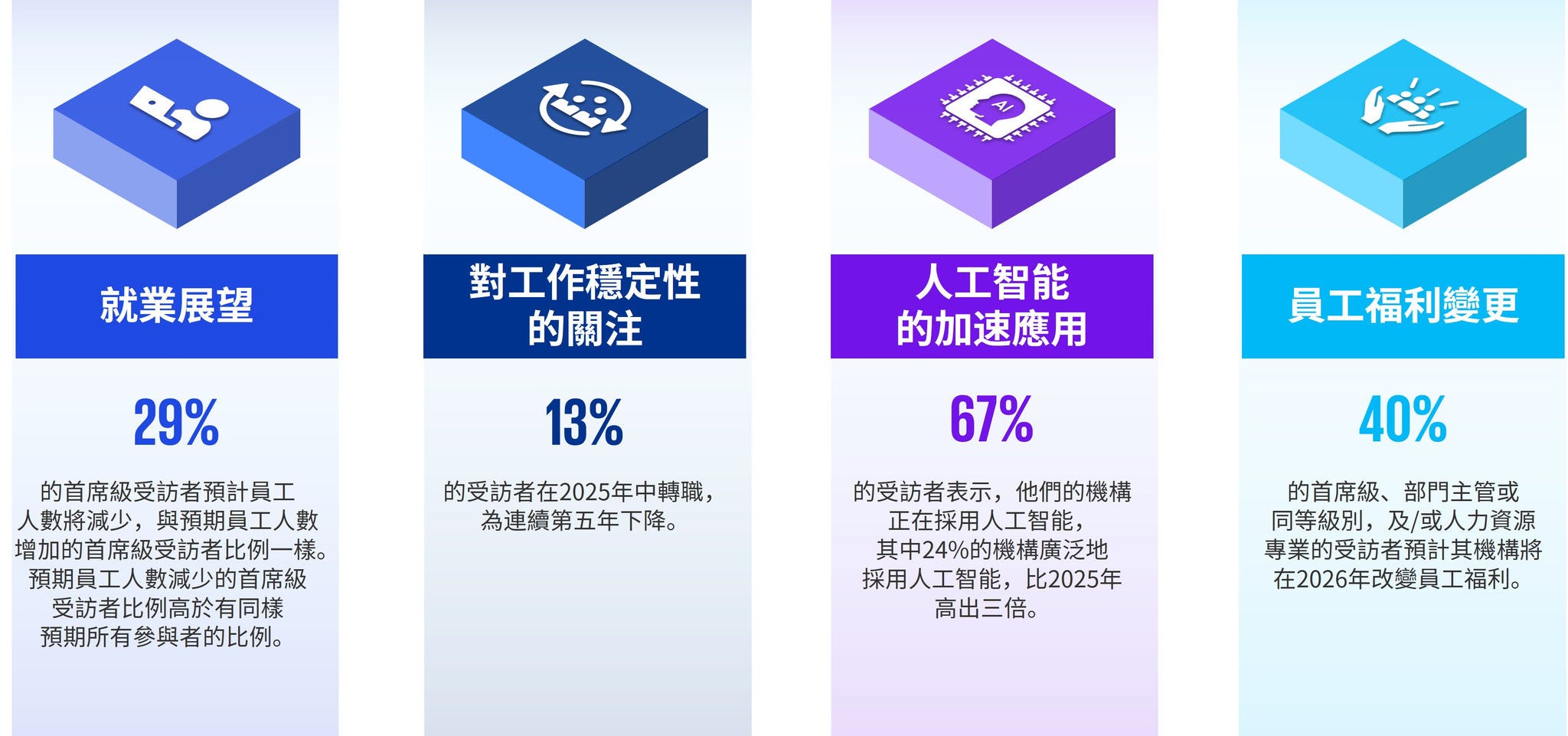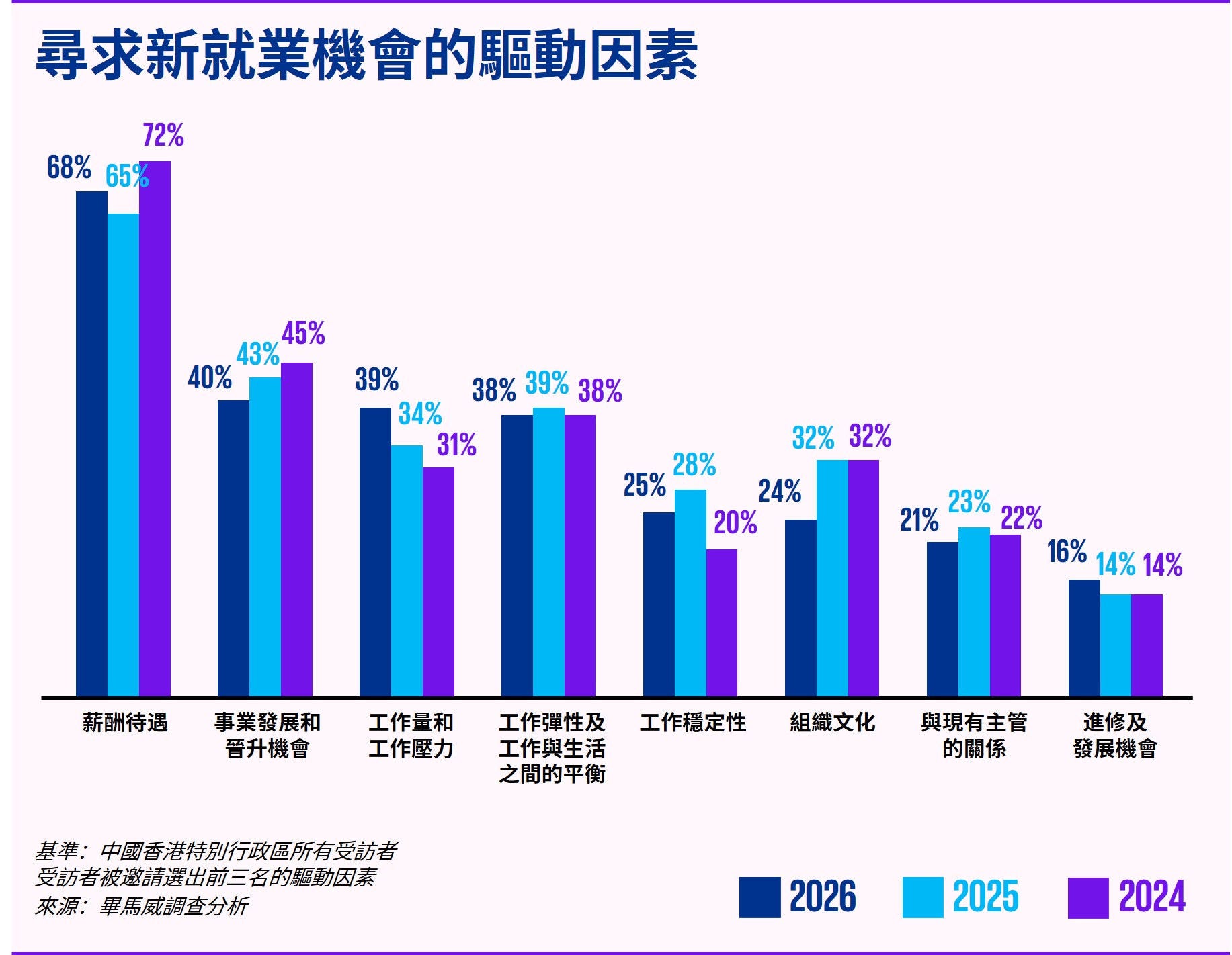 有21%的受訪者表示將考慮在2026年積極尋找新僱主,這一比例較去年的28%有所下降。在留任同一僱主的員工中,有63%獲得了加薪,整體來看,職場人士在尋找新職位時正採取「觀望」態度。