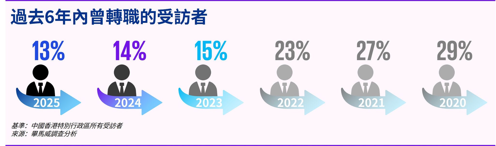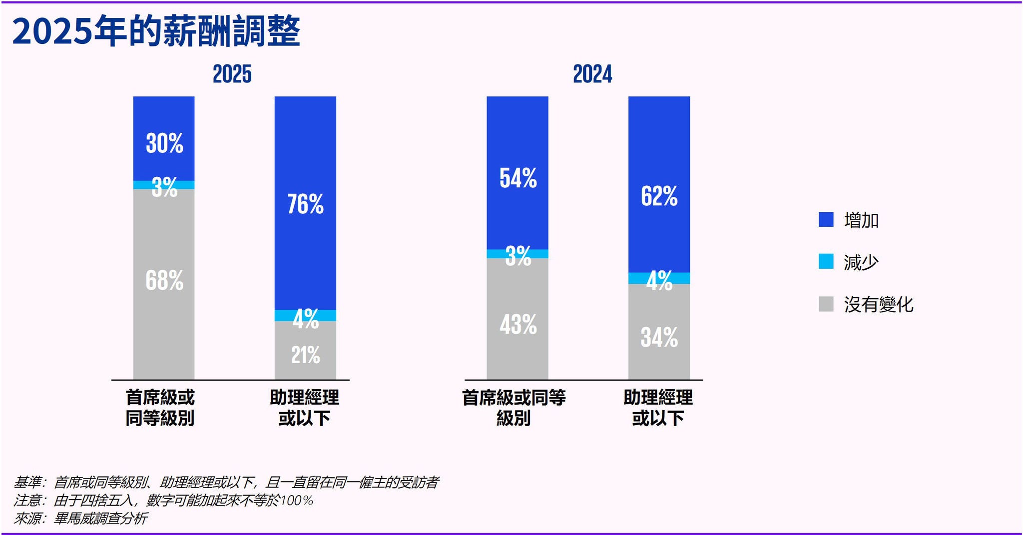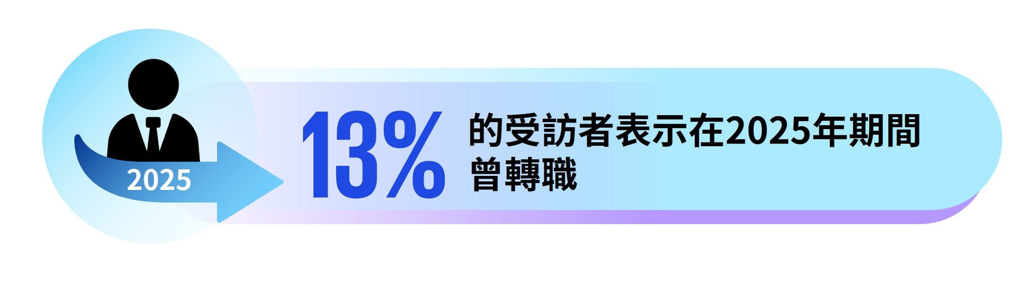 13%的受訪者表示,在2025年期間曾轉職,在包括 IT、公共服務、消費品市場及金融服務在內的主要行業保持與過去兩年相似的水準。在2025期間曾轉職的受訪者中,75%表示薪資有所提升, 比2024年增加了9%。