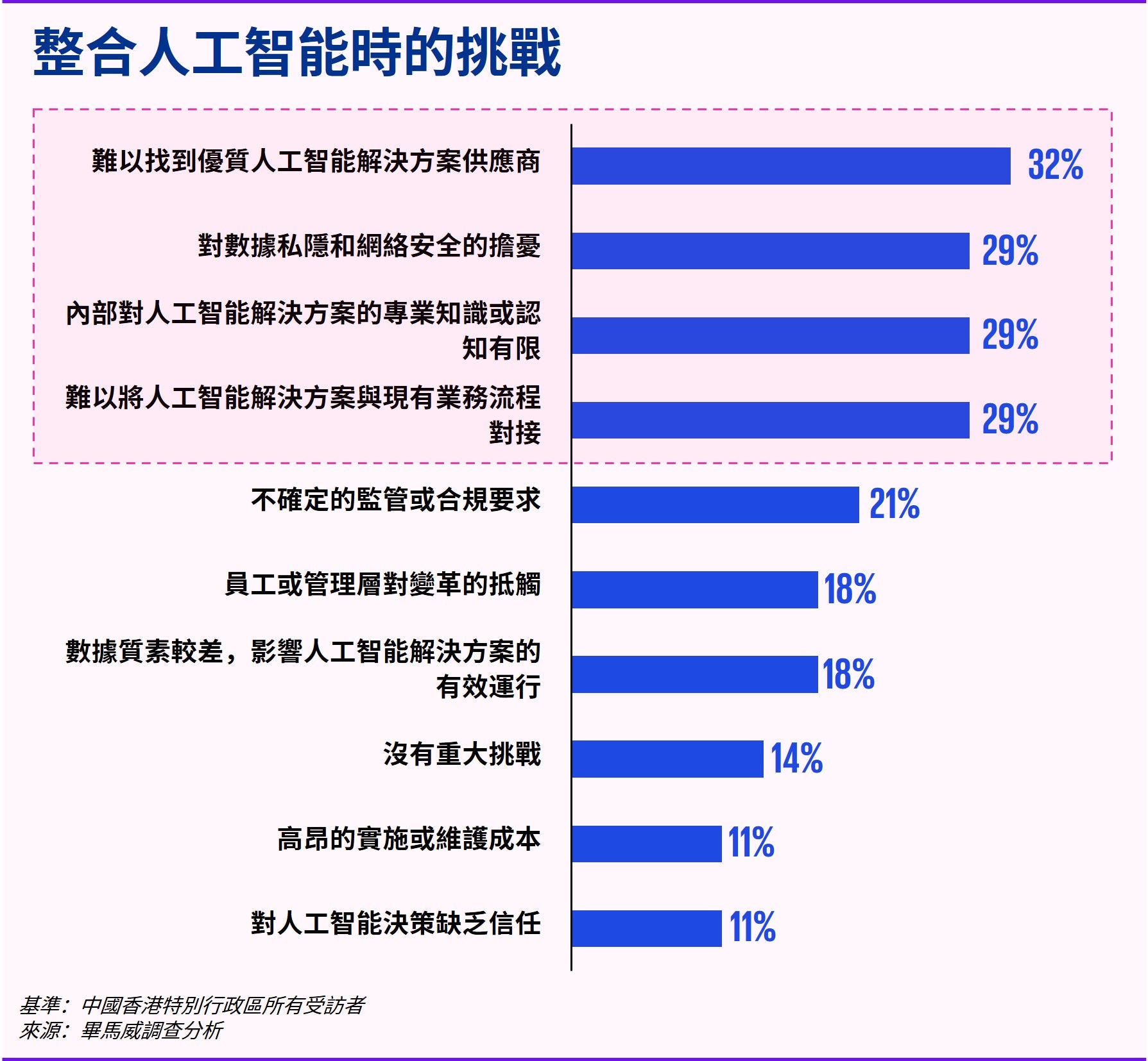 在競爭激烈的市場環境下,識別優質的人工智能解決方案提供商仍然是中國香港企業面臨的主要挑戰之一。此外,數據私隱與網路安全的擔憂、內部對人工智能解決方案的專業知識受限,以及如何將人工智能與現有業務流程有效對齊,也都是企業關注的重點問題。
