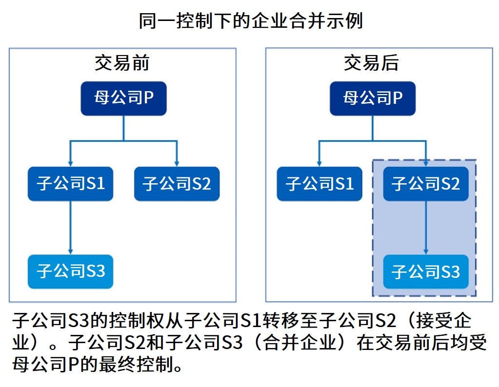 国际财务报告会计准则(IFRS® Accounting Standards)未对同一控制下的企业合并——即参与合并的业务在合并前后均受同一方最终控制的交易(如下图所示)提供指引。