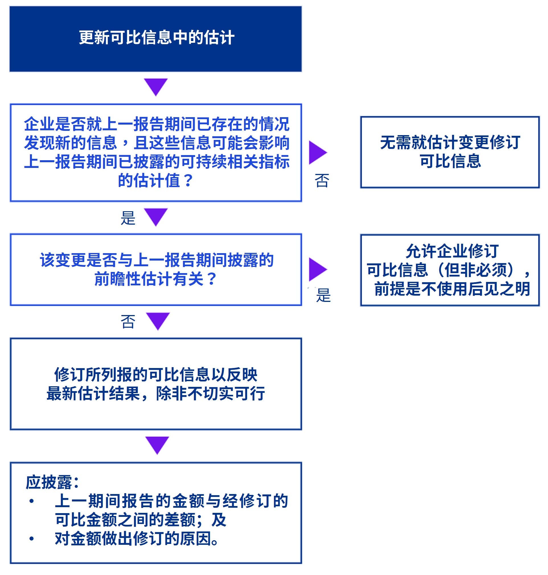 在某些情况下,为可持续相关各项指标列报的可比信息需要反映最新估计结果。此项要求不适用于叙述性披露或前瞻性估计。仅当变更具有重要性时,企业才需要更新可比信息。
