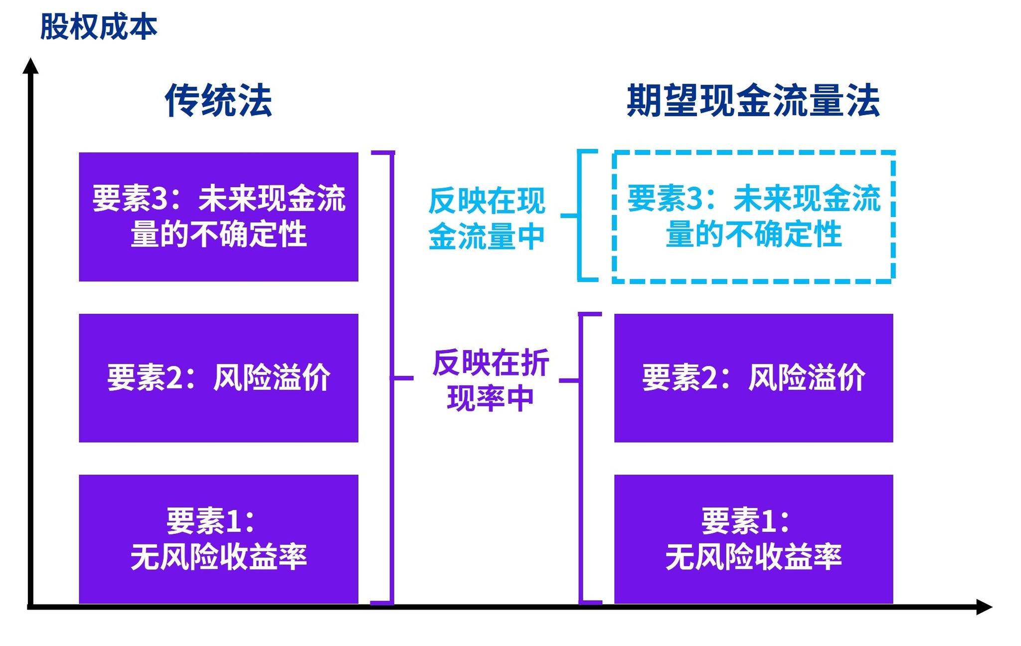 传统法要求针对单一现金流量预测中未考虑的现金流量不确定性作出调整,即通过股权成本中的Alpha系数对加权平均资本成本作出调整。