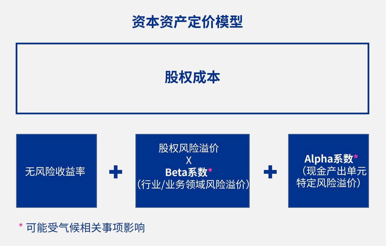 以我们的经验,使用加权平均资本成本(weighted average cost of capital, WACC)公式来估计适当的折现率是最常用的方法。加权平均资本成本公式的一项要素是股权成本,而股权成本通常通过资本资产定价模型(Capital Asset Pricing Model)来计算。气候相关事项可能影响资本资产定价模型中用于计算股权成本的两项输入值——即Alpha系数和Beta系数。[IAS 36.A17(a), Insights 3.10.300.30]