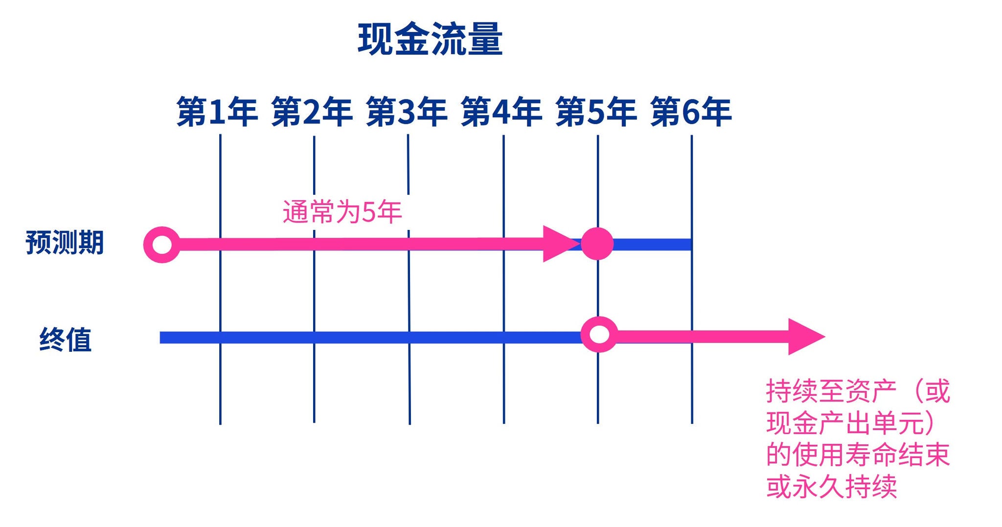 企业在计算可收回金额时通常使用五年预测期。如果企业拥有使用寿命超过预测期的资产(或现金产出单元(cash-generating unit,CGU)),则企业需要计算该资产(或现金产出单元)的终值(terminal value)。
